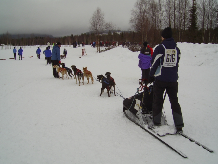 Tag 1 - Starts der 6-Hunde-Klasse, stahlblaue Augen als Beweis für das Huskyerbe trotz Schlappohren und Warten auf das entscheidende "GO"...